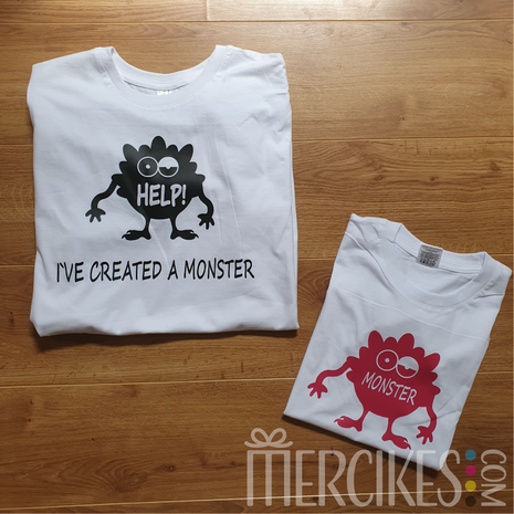 Een grappige set matching t-shirts. Help! I`ve created a monster en een schattig shirt voor het monstertje
