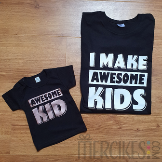 Twee matching shirts met de grappige tekst "I make awesome kids"en "Awesome kid"