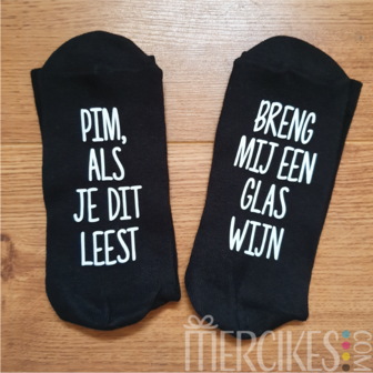 Sokken met tekst bedrukt onderkant - "Naam, als je dit leest, breng mij dan een glas wijn"