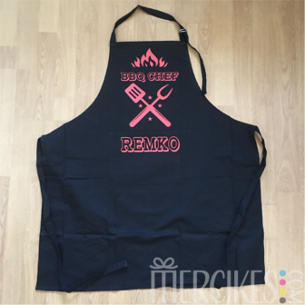 Keukenschort / Kookschort is zwart en de opdruk kun jezelf kiezen. Persoonlijk, zoals jij het wilt.