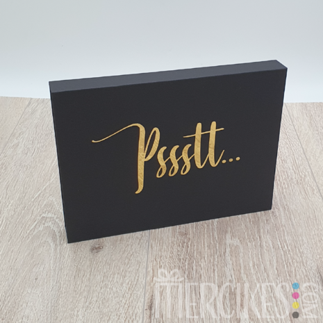 Luxe mat zwart doosje met glanzend gouden tekst "Pssstt..."