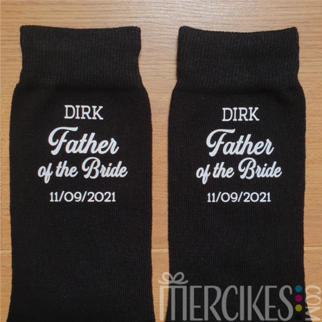 Bedrukte sokken. Op beide sokken komt de naam, father of the bride en de trouwdatum