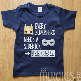 - een wit of lichtroze shirtje met zwarte letters, goud voor superhero en zilver voor sidekick