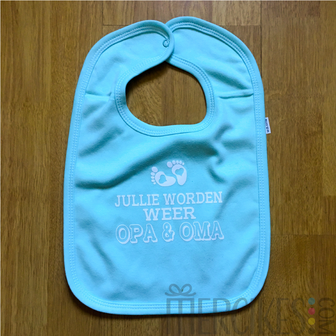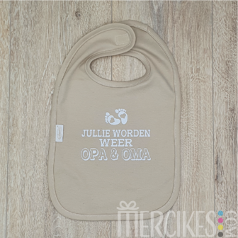 Slabber bedrukt met de tekst; "Jullie worden WEER Opa en Oma" met schattige babyvoetjes