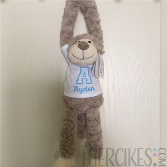 Slingeraapje met T-shirt met naam en voorletter.  Wordt dit de nieuwe favo knuffel? Ook leuk om de kinderkamer mee te personaliseren.