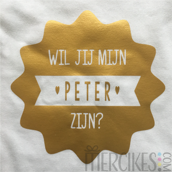 Deze belangrijke vraag staat op het rompertje: "Wil jij mijn Peter / Peetoom zijn?"