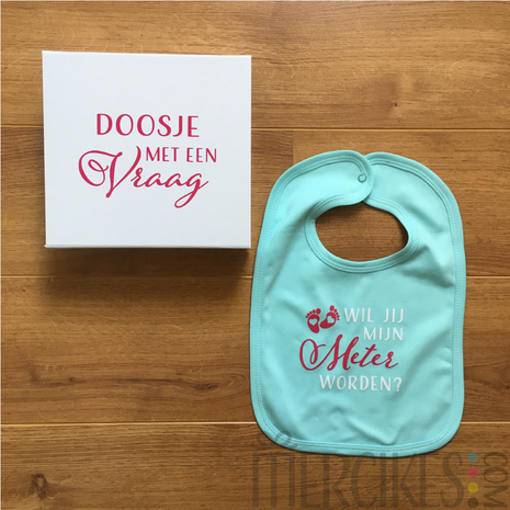 Hierin zit een mintkleurig slabbertje / bib met de belangrijke vraag: Wil jij mijn Meter worden?