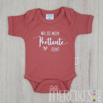 - Roestkleurige romper met witte opdruk "Wil jij mijn Peettante zijn? of Wil jij mijn Meter zijn?