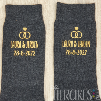 Beide zijkanten van de sokken worden bedrukt met ringen met hartje, de voornamen en de trouwdatum