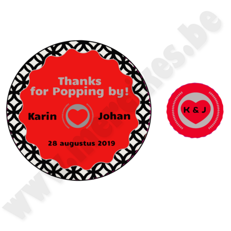 Beker gevuld met popcorn en sticker "Thank for Popping by!"