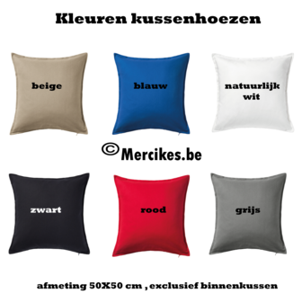 Stel het kussen samen geheel naar eigen smaak! Je kunt de kleur van de kussenhoes én de opdruk kiezen. Vul het in en ik maak het geheel naar jouw wens.