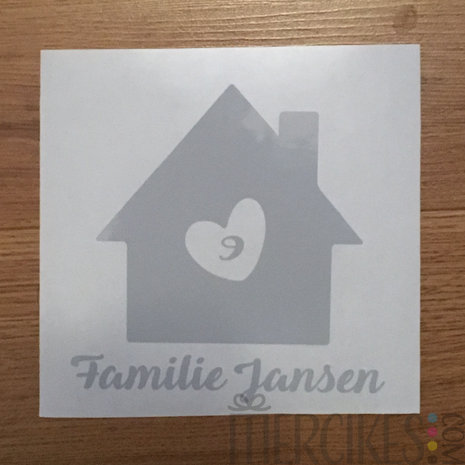 Voordeursticker met huisnummer op een huisje en daaronder de familienaam. Geef je voordeur een metamorfose met deze vrolijke voordeursticker!